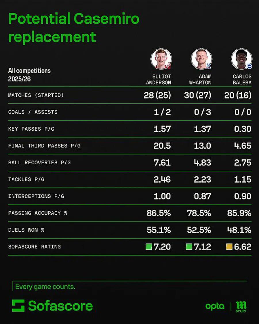 篮球数据-曼联卡塞米罗替代者候选曝光!卡里克仍想冬窗引援,一人去留关键